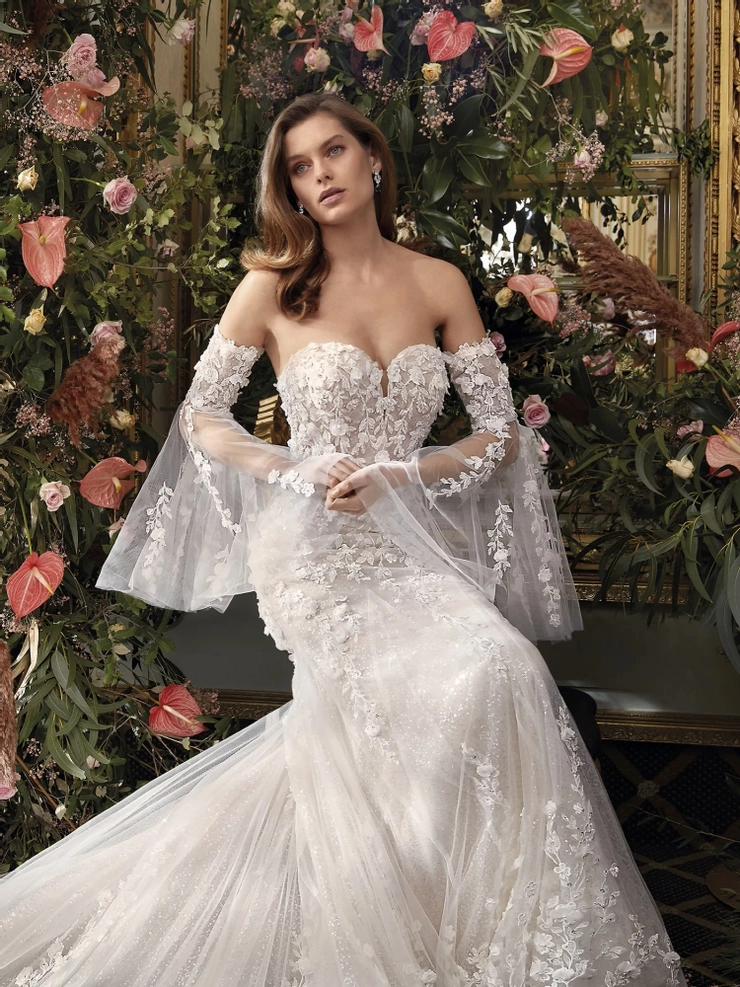 Dripping in petals of bohemian elegance, the IDA gown is a figure-flattering work of art. Every detail of this dress is perfection from the mermaid silhouette to the darling sweetheart neckline to the statement lace-up back. The design comes with the option of billowy sleeves. Gown additions include matching sleeves SL48 (sold separately).